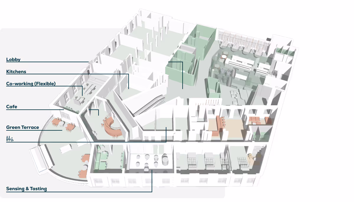 The Future Food Café is planned to engage people to try new food-tech innovations and is planned to spark discussions. The open room layout with flexible furniture in the café and co-working space is meant for transformation according to need. The bar is a part of the tasting and testing hotspot.