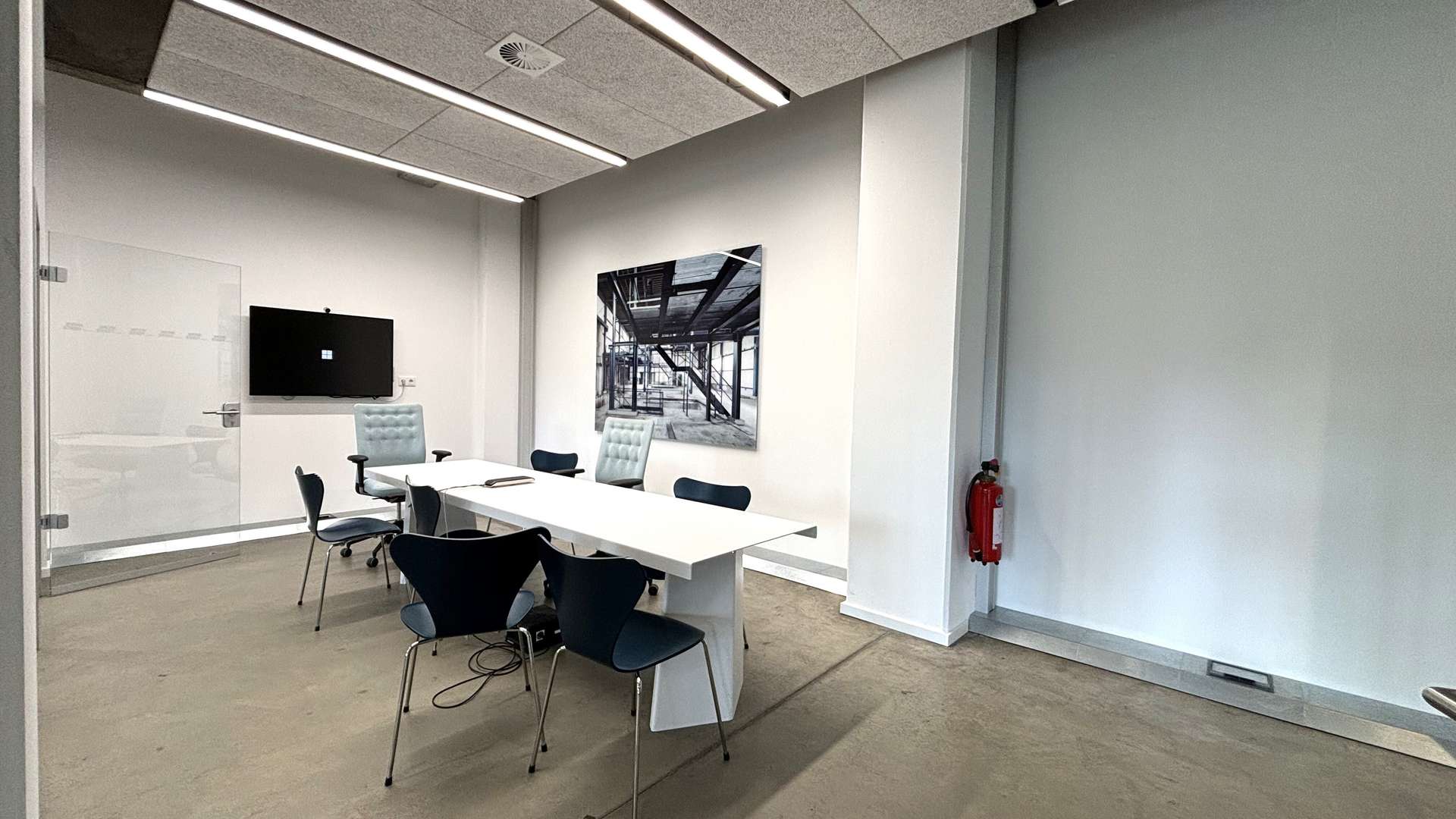 This modern loft office features glass partitions, exposed concrete, and high ceilings. The open workspace includes an integrated kitchen, a dedicated meeting area, and well-maintained restrooms, creating an inspiring and functional environment. With its high-quality furnishings and well-designed layout, the space is perfectly suited for creative companies or technical teams looking to expand their office alongside existing production facilities.